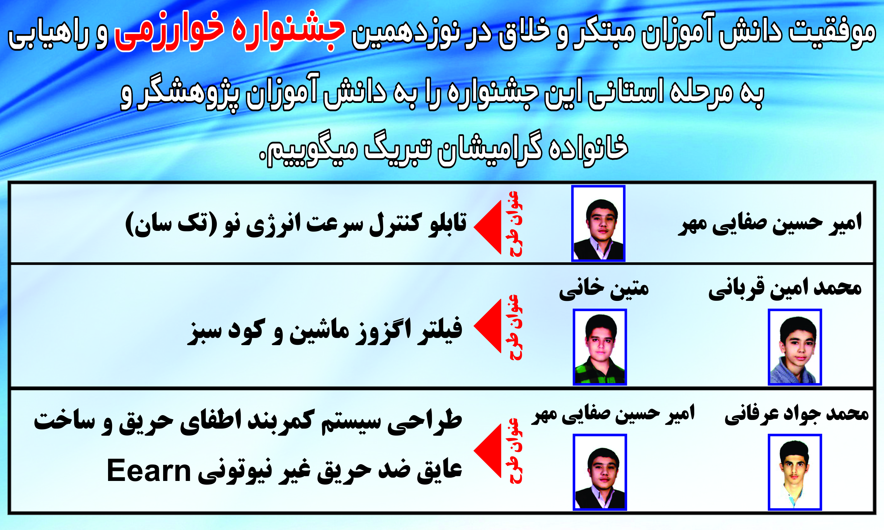 3- پذیرش شش طرح و ایده بعنوان طرحهای برتر در منطقه برای حضور در جشنواره خوارزمی استانی